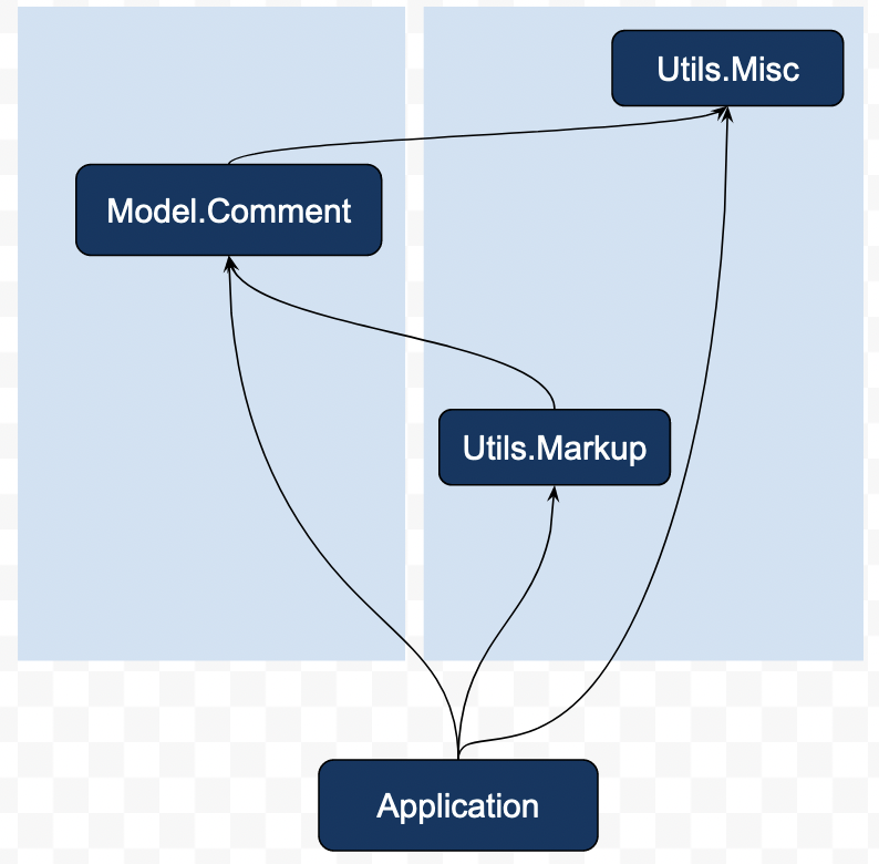 UtilsとModelの二つのディレクトリを設ける。Model.Commentでは、投稿を表すデータ型や、データベースの操作を定義する。Utils.Miscには雑多な便利関数をまとめ、Utils.Markupでは、投稿をHTMLに変換する処理を記述する。
