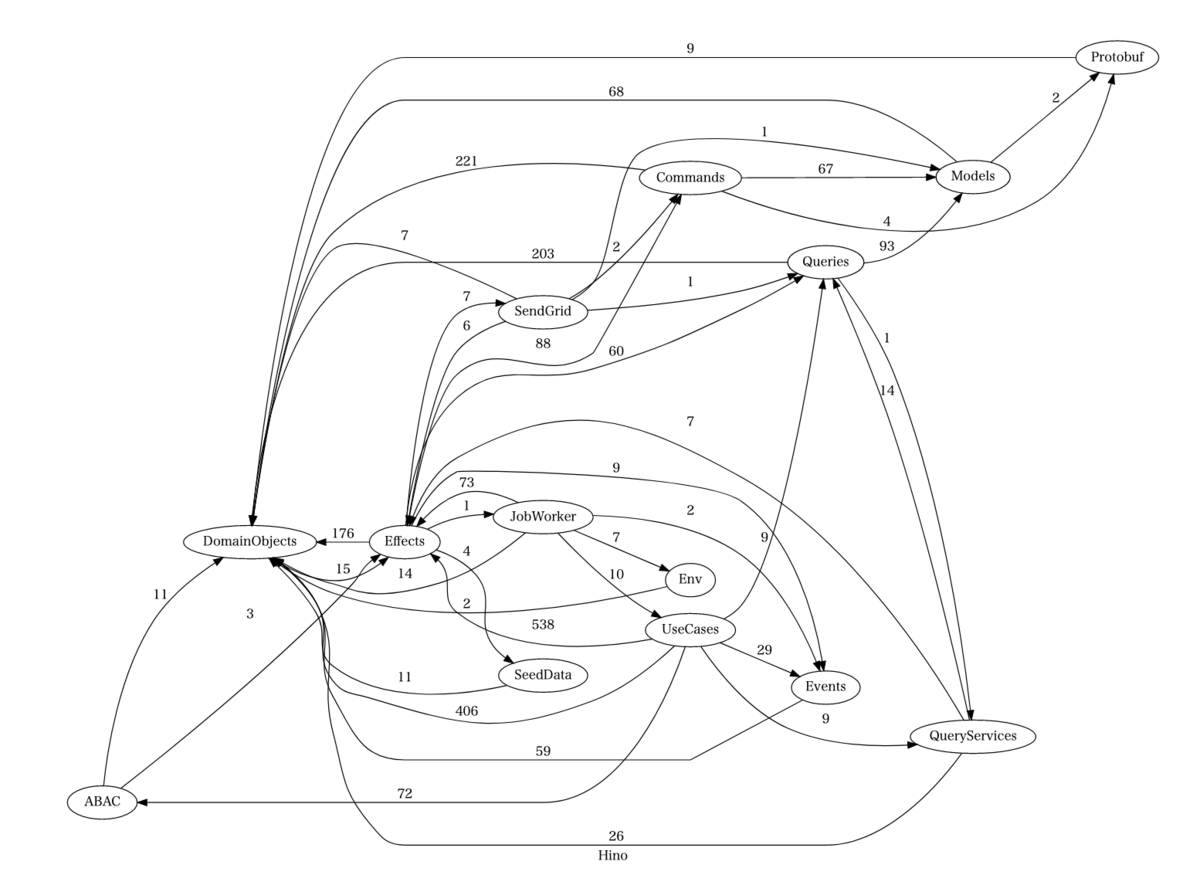 だが本題に戻ろう。ディレクトリの意義を保つためには、相互依存がない──いや、さらに有向閉路が存在しないことを保証したい。つまり、強連結成分分解すればよいのだ。早速会社のコードベースに適用してみると、かなりの大物が釣れた。各辺の重みはインポートの件数を表す。